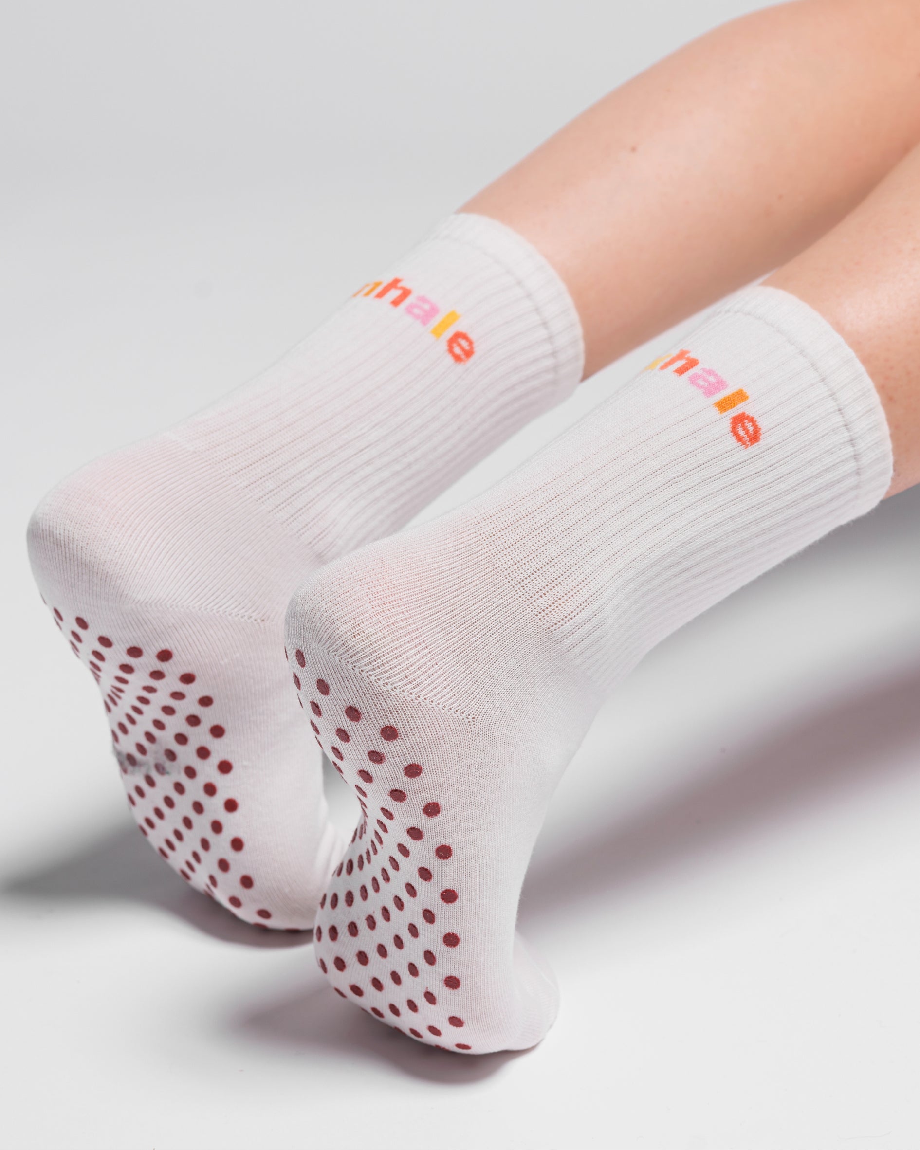 Chaussettes blanches avec mantra inspirant Inhale Exhale en arc-en-ciel.